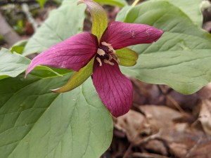Another highlight from this week is the arrival of the spring ephemerals. An ephemeral is a plant with a short life-cycle. The spring ephemerals are plants with a short life cycle that also show up in spring. Spring ephemerals in Northern New England are often located in deciduous forest. The strategy of these plants is to quickly flower and produce seeds before the leaves of the hardwood trees come out and block a lot of the sunlight from reaching the forest floor. Some notable spring ephemerals are the Dutchmen’s Breeches and the Trillium. I was able to locate both of these flowers over the weekend.