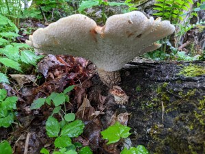 This beautiful bracket mushroom’s scientific name is Polyporus squamosus. It’s common name is Dryad’s Saddle.  These polyporus fungus can either grow on fallen logs and tree stumps in a saprophytic relationship, or may be found as a parasitic growth on hardwood trees such as maple and elm. They have widespread distribution including being found in North America, Australia, Asia, and Europe.  Dryad’s saddle can range in size from 4 to 24” and can get to almost 2” thick.(1)