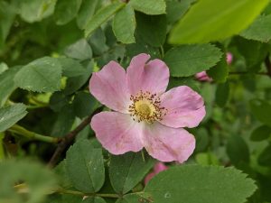 In my experience the Swamp Rose often grows alongside blackberries and raspberries.  Both blackberries and raspberries are a part of the same family of plants known as Rosaceae.  As these plants compete for sunlight they intertwine with each other and create an almost impenetrable bramble.