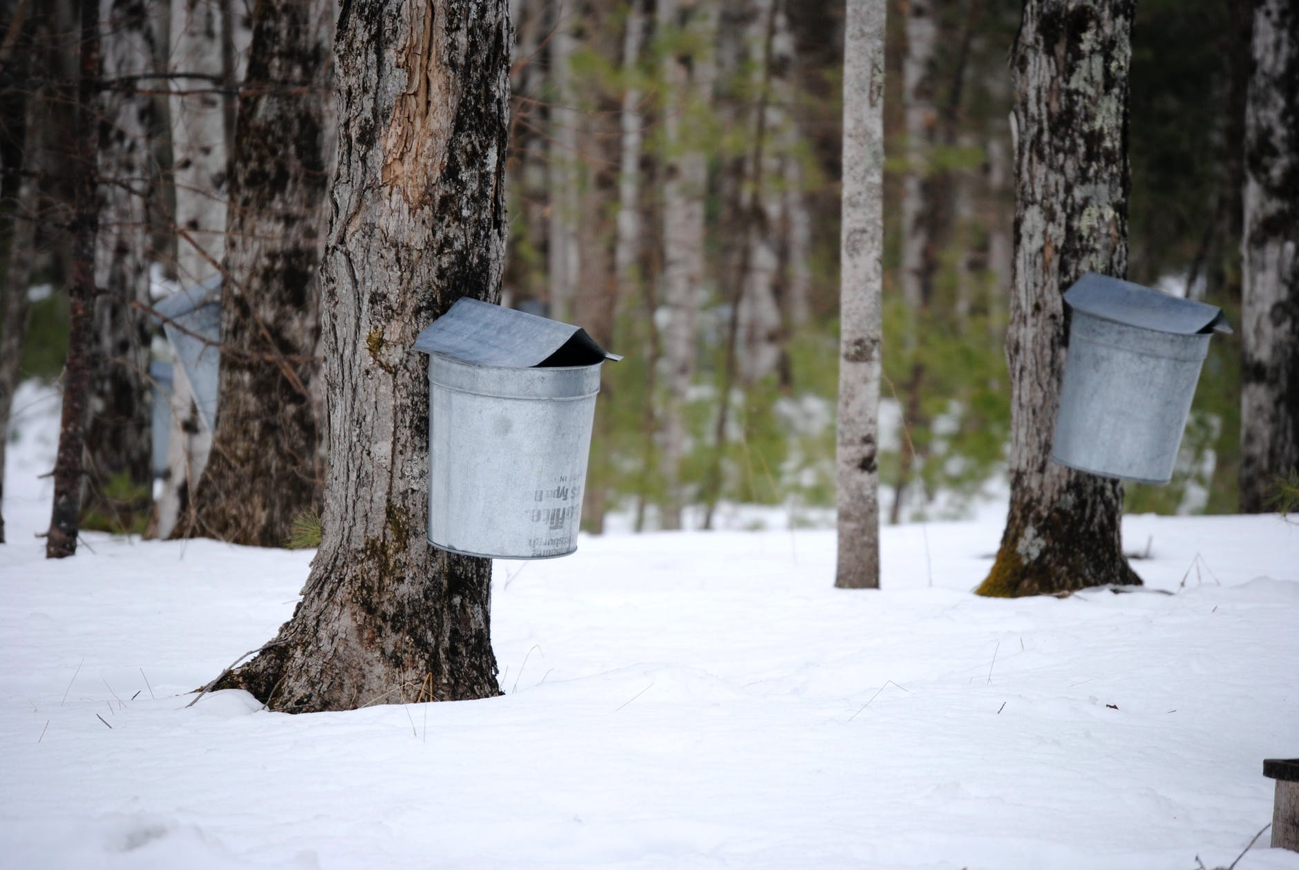 Maple trees with sap buckets/ Photo by Matt Barnard Pexel