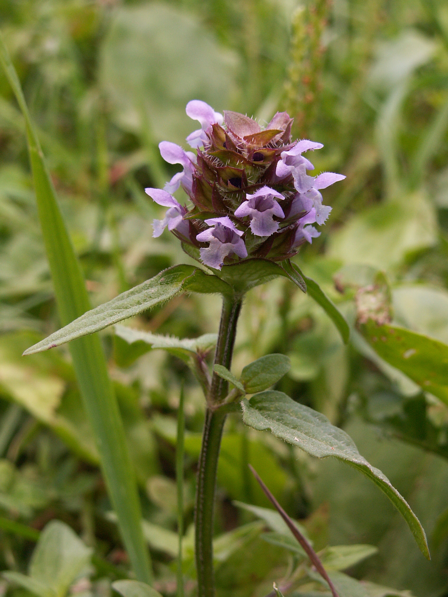 Like other plants in the mint family, the self-heal has toothed leaves that grow opposite of each other on a square stem. These leaves are either egg-shaped or lanced-shaped. The flowers of the self-heal can be violet or purple, and they grow around spikes, or heads, with overlapping bracts.  A bract is a “modified, usually small, leaflike structure often positioned beneath a flower.(4)  Bracts can sometimes be confused with flower petals because of their proximity to the central flower.