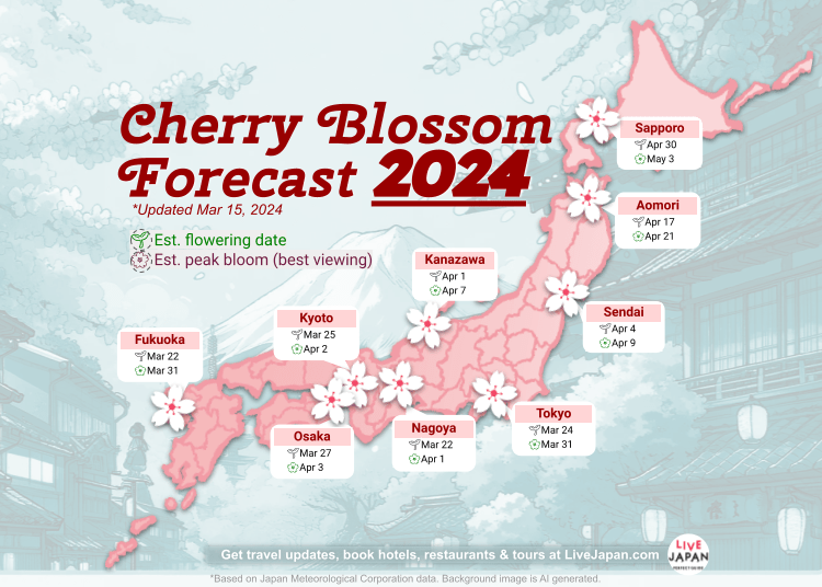 To help people locate the best cherry blooms, the Japan Meteorological Corporation publishes a cherry blossom forecast map. This map estimates the beginning and peak bloom times across Japan.